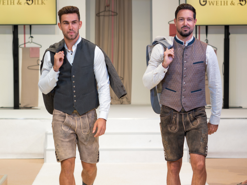 Die Herrenmode spiegelt den Wandel einer neuen Generation. Wenn junge Männer zur Lederhose greifen, tun sie das mit urbaner Selbstverständlichkeit. Lässig kombinierte Hemden, reduzierte Stehkragensakkos und moderne Schnitte prägen das Bild. Die Tracht verliert ihre Festtagsschwere und zeigt sich wandelbar – ob im kompletten Set oder als stilvolles Zitat im Alltagslook. Accessoires spielen dabei die Rolle des stilistischen Feinschliffs.